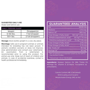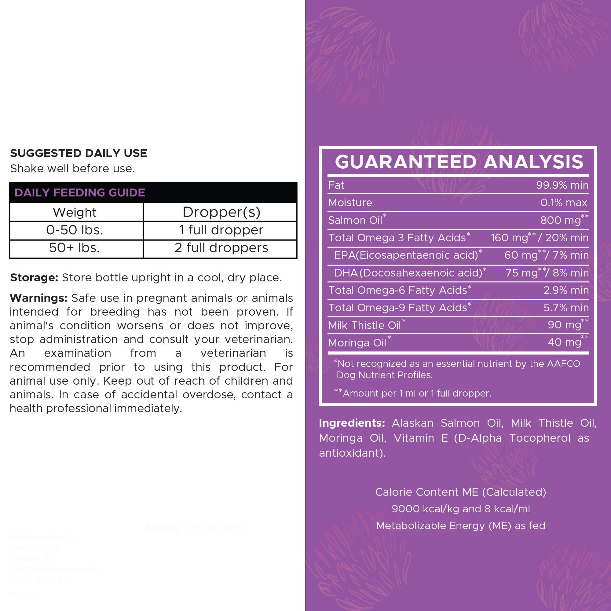 - Milk thistle oil supports vital organs like the liver and kidneys, moringa oil supports immune and brain function, and wild Alaskan salmon oil supports skin and coat health.
