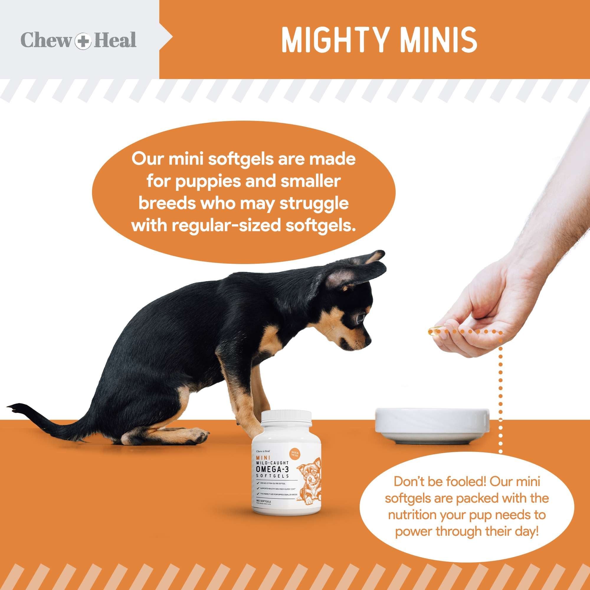 Chew + Heal Mini Wild-Caught Omega-3 Softgels Skin & Coat Supplement for Puppies is made with wild-caught fish oil and comes tiny 300 mg softgels ideal for puppies and small breeds. This wild-caught fish oil supplement is packed with omega goodness to add nourishment to your furry friend’s coat, joints, and overall health. Crafted with a blend of herring, mackerel, anchovy and sardine oil, this product is designed with even the pickiest eaters in mind. It can be easily concealed in their food or spread over meals, so your pal won’t even know it’s there! Give your furbaby support for a luxurious coat and beautifully healthy skin with Chew + Heal’s Omega Softgels today.