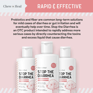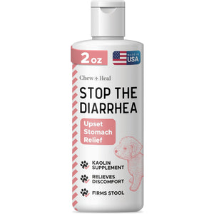 Say goodbye to your pets diarrhea troubles with Chew + Heal Stop The Diarrhea Liquid Digestive Aid for Dogs. This natural and effective solution is made with kaolin, a clay mineral known for its absorbent properties. Kaolin helps manage diarrhea in animals by absorbing excess fluids and toxins in the digestive tract, promoting firmer stools and reducing gastrointestinal discomfort. Stop The Diarrhea is suitable for dogs experiencing mild to serious diarrhea. Plus, the tasteless formula can be easily fed directly or mixed into food.