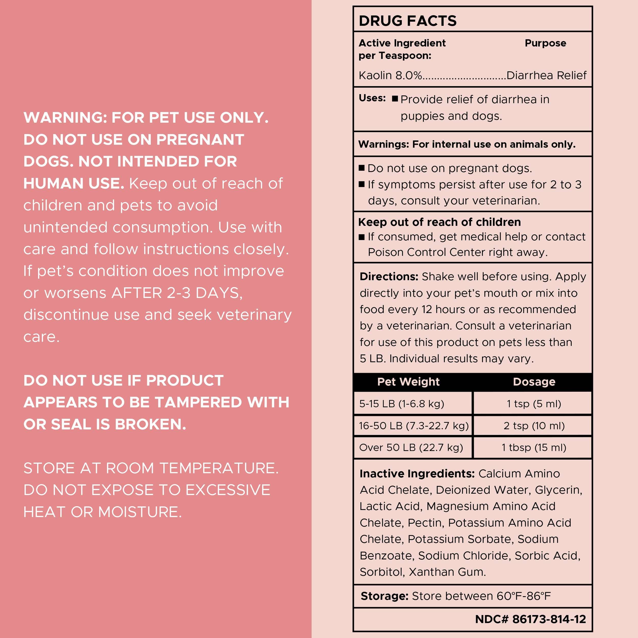 Warning: For pet use only. Do not use on pregnant dogs. Not intended for human use. Keep out of reach of children and pets to avoid unintended consumption. Use with care and follow instructions closely. If pet’s condition does not improve or worsens after 2-3 days, discontinue use and seek veterinary care. Do not use if product appears to be tampered with or seak is broken. Store at room temperature. Do not expose to excessive heat or moisture.