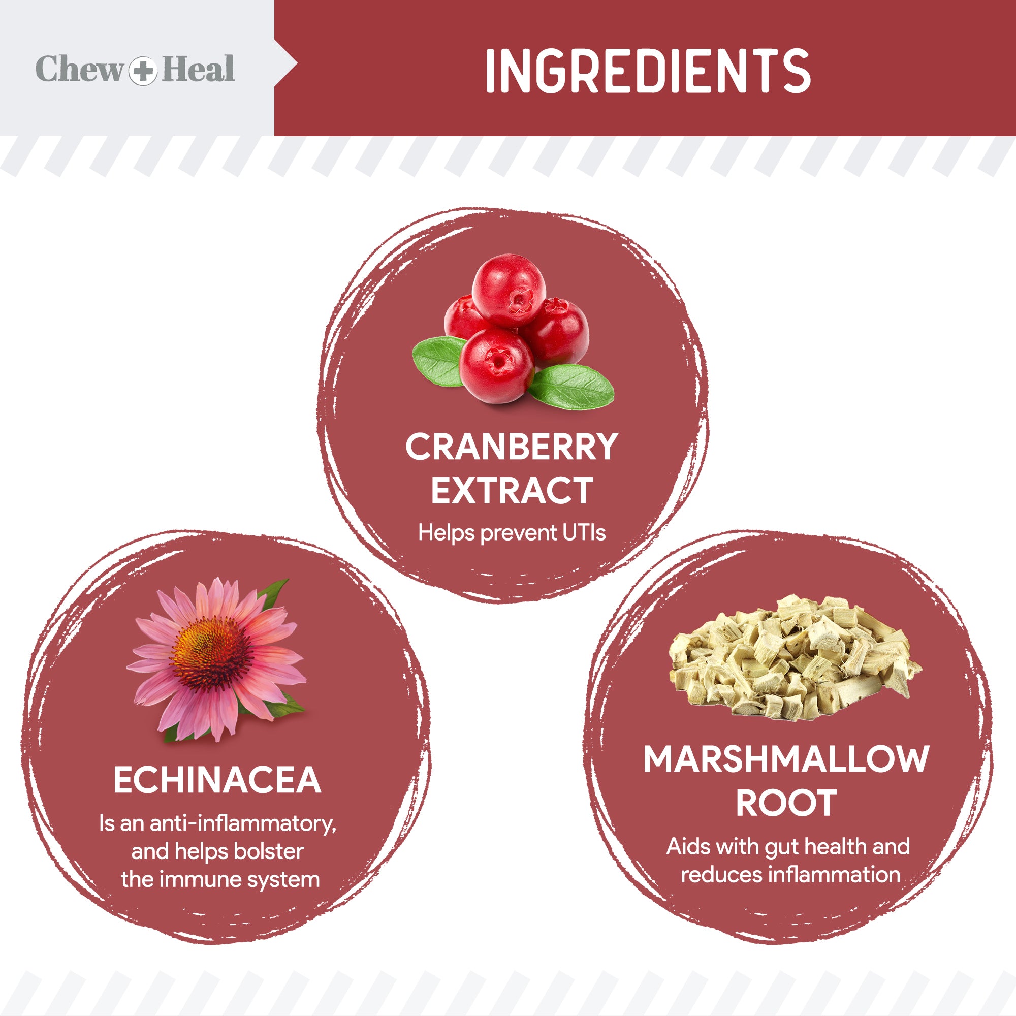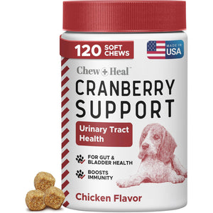 You know how uncomfortable your dog is when he is dealing with urinary tract or bladder issues, and as pet parent, you want to do whatever you can to help. Chew and Heal UTI Treatment Cranberry Chews Dog Supplement is formulated with cranberry to help prevent bladder infections, and echinacea, Oregon grape root, to help boost your dog’s immune system. The added marshmallow root then works to protect your canine companion’s bladder against irritants, by providing a soothing and lubricating barrier. A hard-working soft chew that supports the health of your dog’s bladder, urinary tract, immune system and urethra, Chew and Heal UTI Treatment Cranberry Chews Dog Supplement is safe and effective for dogs of all sizes, even massive breeds. With a delicious taste dogs love, he won’t even believe it’s good for him, too.