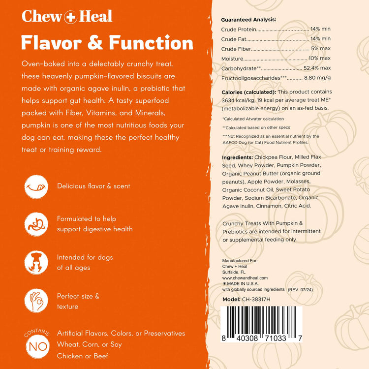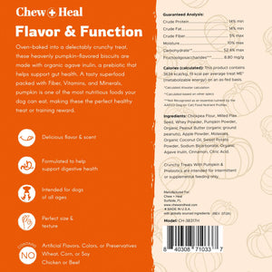 Has your dog tried Chew + Heal Pumpkin & Prebiotic Fiber Crunchy Biscuit Dog Treats? Treat your furry friend to a delicious and nutritious snack with these oven-baked pumpkin-flavored biscuits. Made with agave inulin, a powerful prebiotic, these crunchy treats support your dog’s gut health and provide a tasty superfood packed with fiber, vitamins, and minerals. Whether your pet is a puppy, adult, or senior, these biscuits are the perfect reward for good behavior or a tasty snack in between meals. Plus, with a delightful blend of pumpkin, peanut butter, and cinnamon, your dog will be begging for more of these healthy and satisfying treats.