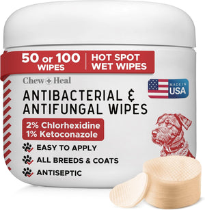 Pet parents, give your furry friend the relief they need with Chew + Heal Antibacterial & Antifungal Chlorhexidine & Ketoconazole Dog & Cat Grooming Wipes. These professional-grade topical pads are specially formulated to manage skin infections in dogs. Each pre-moistened wipe contains a precise combination of chlorhexidine (2%) and ketoconazole (1%), two active ingredients known for their broad-spectrum antimicrobial and antifungal efficacy. Together, they work to target a wide range of common skin pathogens, including bacteria and fungi responsible for conditions such as pyoderma, ringworm, yeast overgrowth, and superficial dermatitis. These wipes are for external use only and should be used under veterinary guidance for optimal results, especially in cases of persistent or severe dermatoses.
