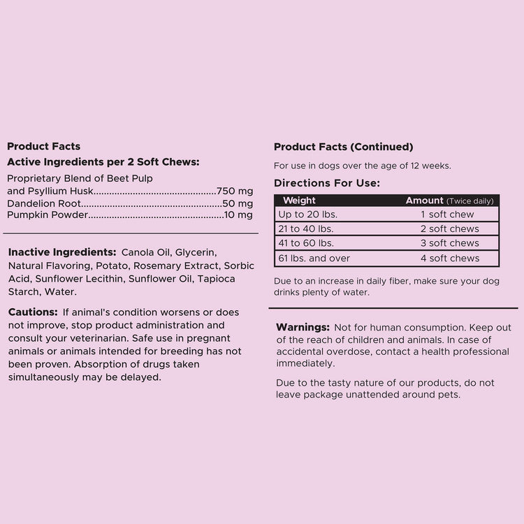 - Made with natural ingredients like psyllium husk, dandelion root, pumpkin, beet pulp, rosemary and sunflower lecithin.