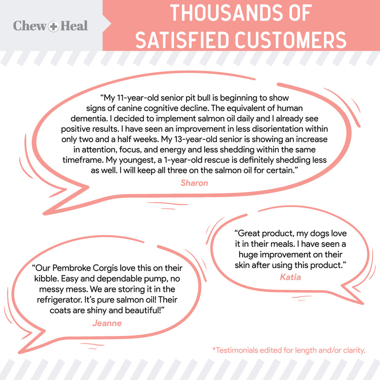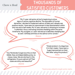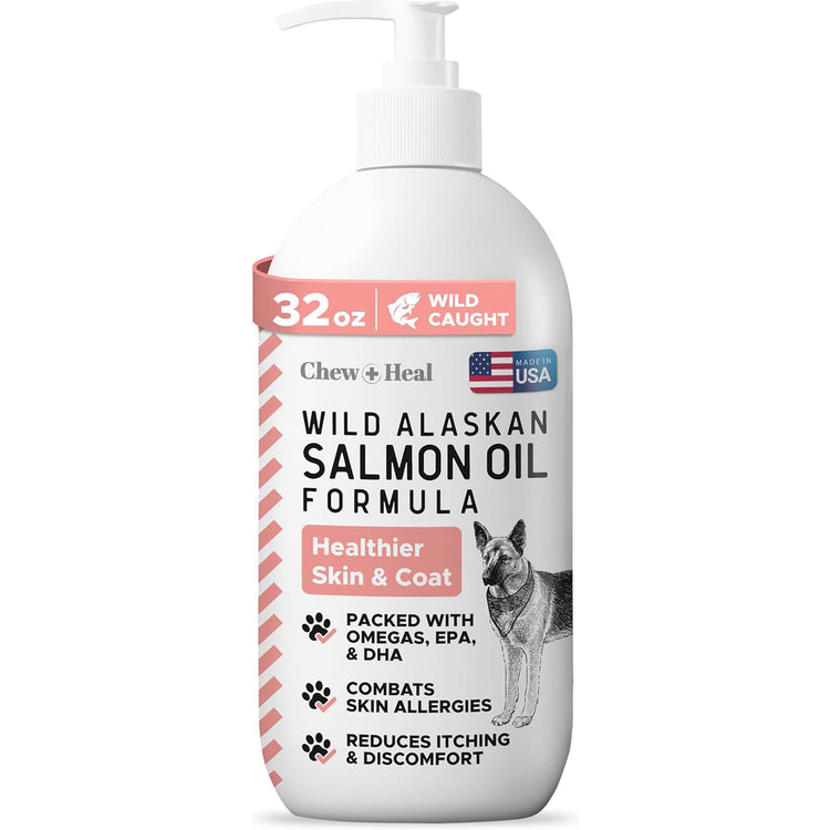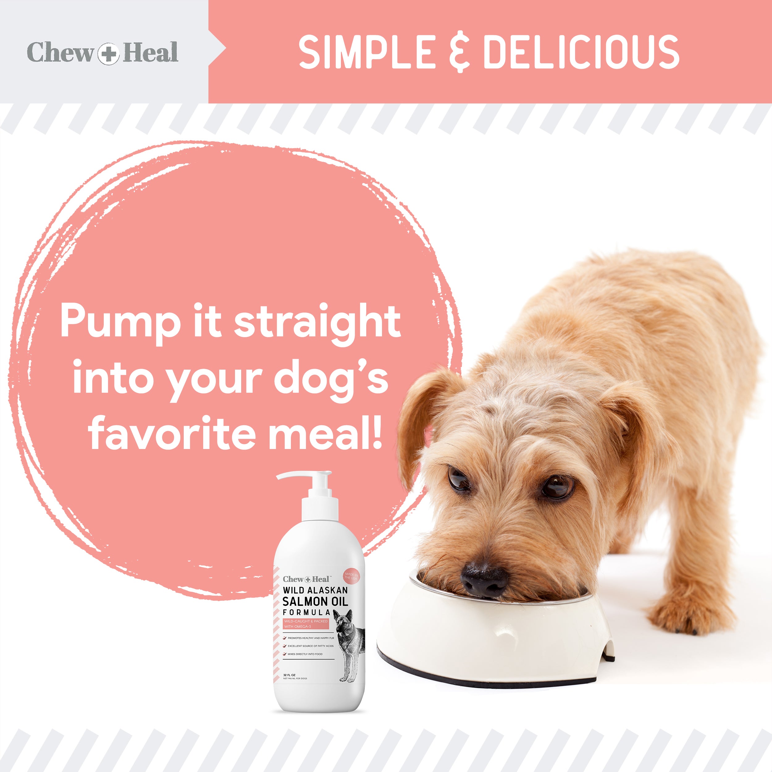 The Chew + Heal Pure Wild Alaskan Omega Salmon Oil Skin & Coat Liquid Supplement for Dogs is a su-paw tasty way to help keep your furbaby looking and feeling paw-some! It’s packed with vitamins, minerals, fatty acids and antioxidants to support a luxurious coat and healthy skin. It also works to help prevent bald spots, reduce excess shedding and moisturize dry, brittle hair. Unlike other salmon oils that feature blends of farmed salmon, this oil only uses wild-caught Alaskan salmon.
