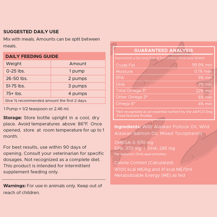 - Wild-caught Alaskan fish oil supplement works to support your furbaby’s skin, coat, hips and joints, heart and immune system.