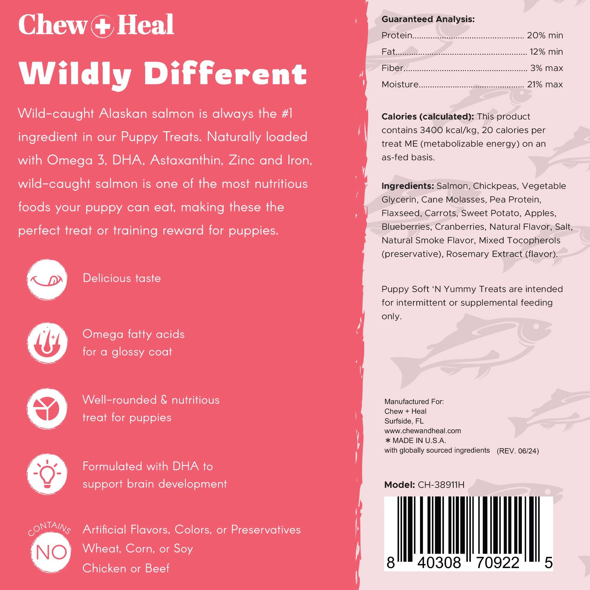 Give your furry little one the best start in life with Chew + Heal Puppy Soft ‘N Yummy Wild Alaskan Salmon Limited Ingredient Jerky Dog Treats. Made with wild-caught salmon as the first ingredient, these extra-soft and durable treats are packed with essential vitamins and antioxidants to support your puppy’s health and growth. Plus, the addition of chickpeas, flaxseed, carrots, sweet potato, apples, blueberries, and cranberries makes these treats a tasty and nutritious snack for your furbaby. With no wheat, corn, soy, chicken, beef, artificial flavors, colors, or preservatives, these treats are a great choice for four-legged family members with sensitivities. Treat your pup to the delicious and healthy goodness of Chew + Heal’s Wild Alaskan Salmon Jerky Treats.