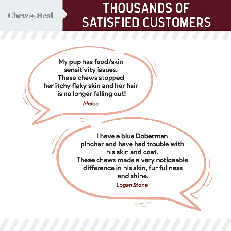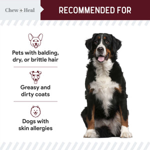 Give your furry friend the gift of a healthy, shiny coat with Chew + Heal Savory Lamb Omega Skin & Coat Supplement for Dogs & Cats. This supplement is specially crafted with omega fatty acids from salmon, fish, and flaxseed oils to promote your pet’s skin and coat health. Say goodbye to dandruff and itchy skin, as this supplement moisturizes and leaves your pal’s skin feeling soft and his coat looking shiny and smooth. With the added benefits of omega-3 and omega-6, this supplement also helps maintain immunity and promote cognitive function. Plus, it contains essential nutrients like calcium, phosphorus, vitamin E, and zinc to support cell growth, nutrient absorption, skin function, and joint health. Formulated with Brewer’s yeast, B vitamins, biotin, EPA, and DHA, this dietary supplement also helps reduce shedding, dirty appearance, and bald spots, so your pet is always show ready.