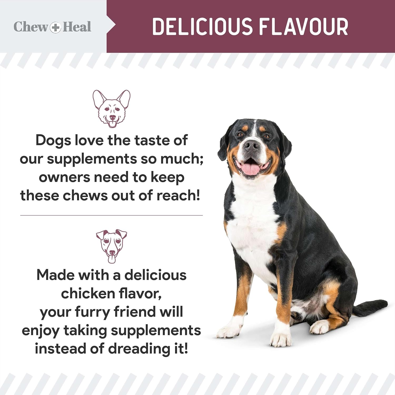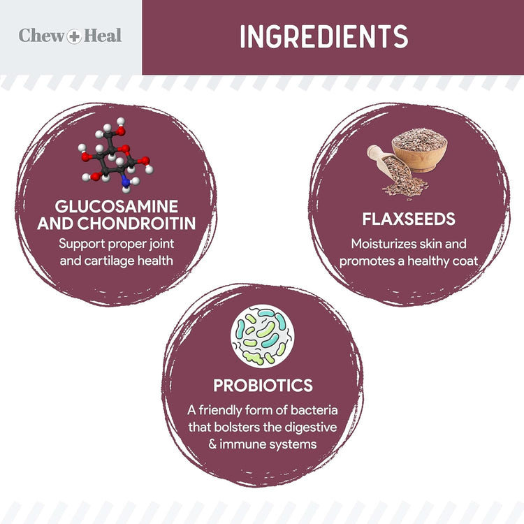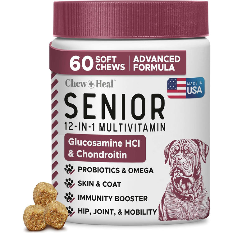 Help your senior dog thrive with Chew + Heal Senior 12-In-1 Advanced Multivitamin Soft Chews Supplement. Designed specifically for aging pups, this daily supplement provides a targeted blend of essential vitamins, minerals, and advanced nutraceuticals to support their overall health. It helps to promote skin and coat health, boost the immune system, aid digestion, support cognitive function, and maintain healthy liver, kidney, heart, cartilage, and joint health. Plus, with higher amounts of glucosamine and vitamin C, it helps your senior pet will feel their best every single day.