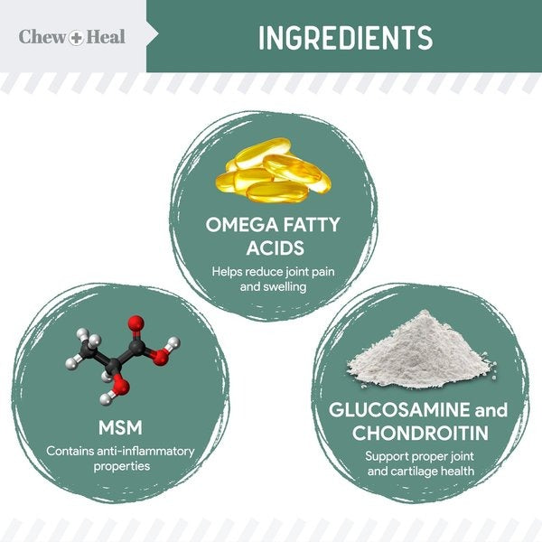 - Contains glucosamine, MSM and chondroitin to help reduce pain and inflammation, improve mobility and increase joint lubrication.