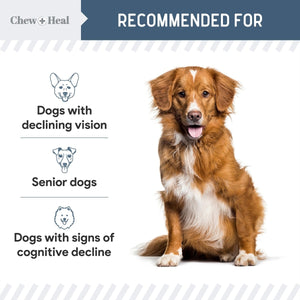 Give your senior furry friend the support he needs with Chew + Heal Senior Vision + Cognition Soft Chews Supplement. This professionally formulated dietary supplement is designed to promote overall ocular and cognitive health in senior dogs. The easily administered, chewable supplements contain a targeted blend of key nutrients and botanical extracts known for their roles in maintaining physiological functions associated with aging.