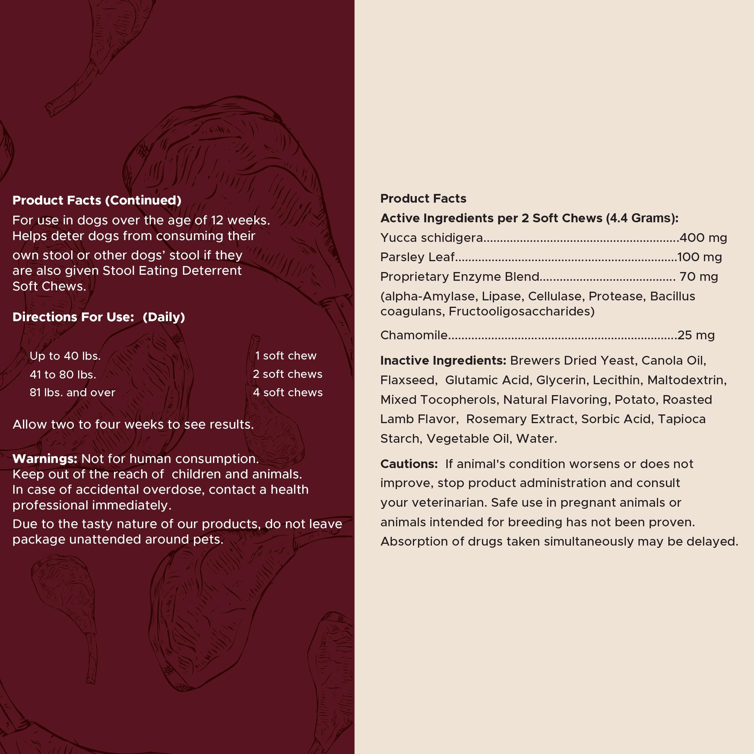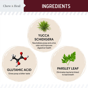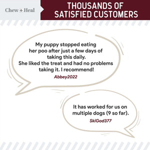 - This soft chew supplement discourages coprophagia (poop eating) by using glutamic acid to make feces taste unpleasant for your pup.