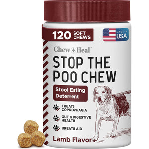 Say goodbye to your pup’s poop-eating habit with Chew + Heal Roasted Lamb Stop the Poo Soft Chew Coprophagia & Digestive Supplement for Dogs. This easy-to-administer supplement contains digestive enzymes to improve gut health and eliminate the root cause of this undesirable behavior. It also includes natural vitamins and minerals to discourage your furry friend from eating poop. With the help of glutamic acid, this supplement makes feces taste unappetizing to your pooch. Yucca is also added to neutralize urine and stool odor, while parsley leaf freshens your pup’s breath. Additionally, chamomile supports digestion, and a special blend of digestive enzymes helps your companion better absorb nutrients. Suitable for dogs 12 weeks and older, this delicious supplement is a must-have for pet parents looking to keep their pooch’s digestive system in check.